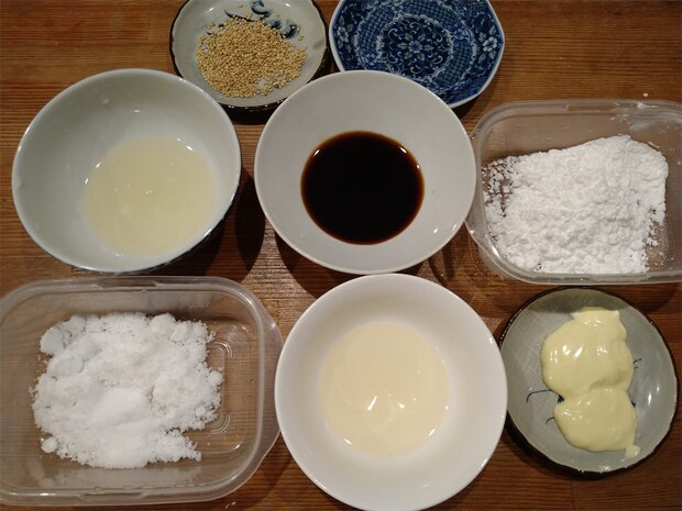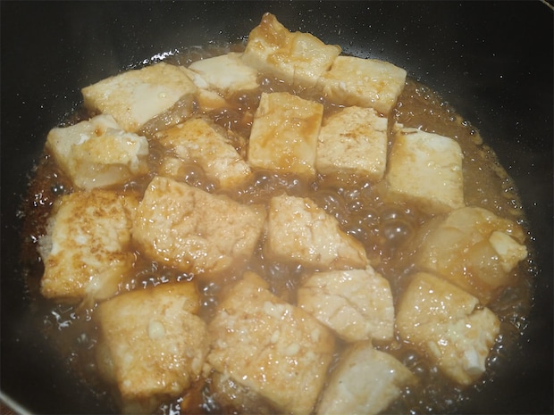 7. 6に、[A]のしょうゆ、みりん、砂糖、酢、マヨネーズを混ぜ合わせたものを加えて、弱火で煮る。
