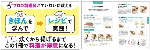 きほんのページでは包丁の使い方や火の扱い方などを丁寧に解説し、順番やひと手間かける理由まで、プロの調理師がわかりやすく説明します。