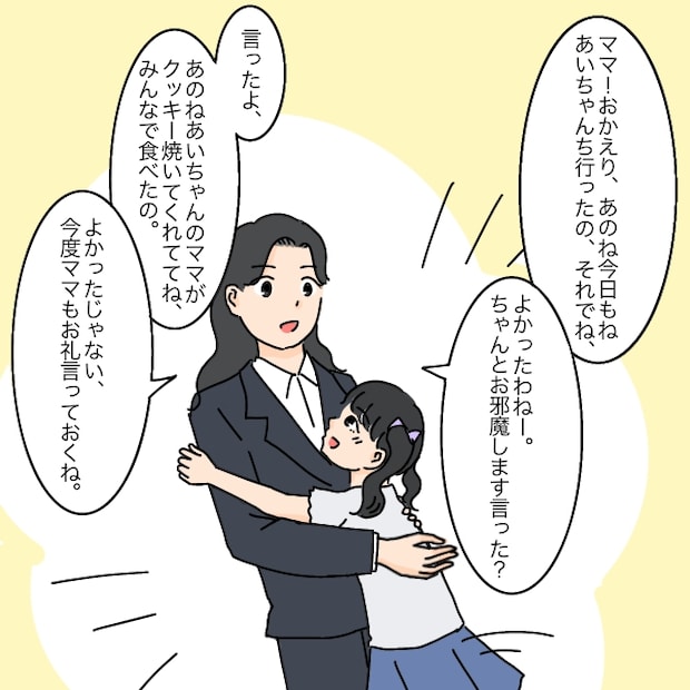 まりあちゃんはお母さんに勢いよく抱きつくと、「ママおかえり!今日もあいちゃんち行ったの、それであいちゃんママがクッキー焼いてくれててね・・・」と、今日あった出来事を嬉しそうに話し始めました。それを聞いたお母さんは、フフッと微笑んで「よかったじゃない、今度ママもお礼言っておくね」と返します。