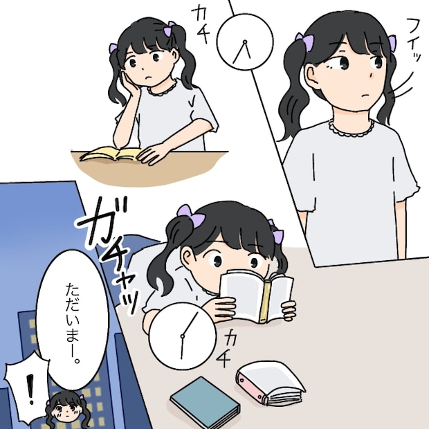 ですが、まりあちゃんにとってこれはいつものことでした。特に気にする様子もなく部屋に入ると、宿題をしたり、シールを眺めたりしながら1人の時間を過ごします。そうこうして時刻が18時を過ぎた頃、「ただいまー」とお母さんが帰ってきました。