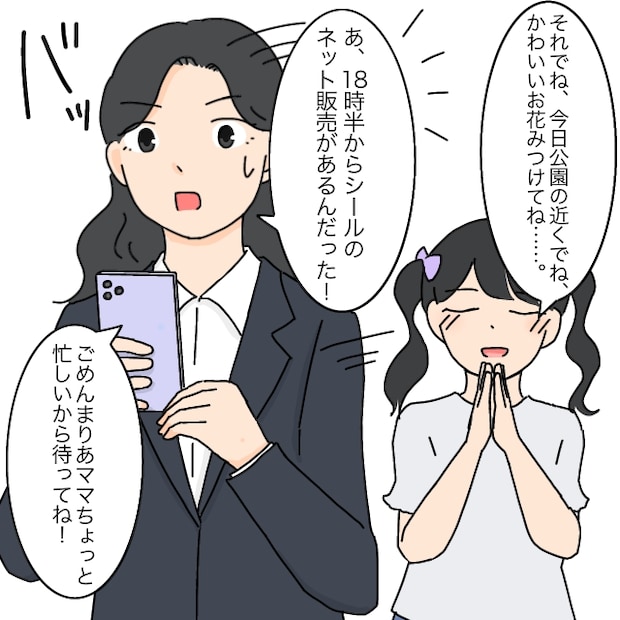 まりあちゃんはまだ話し足りない様子で、「それでね、今日公園の近くでかわいいお花みつけてね・・・」と続けようとします。しかし、お母さんの「あ!18時半からシールのネット販売があるんだった!ごめんまりあ、ママちょっと忙しいから待ってね!」という言葉に、話を遮られてしまいました。