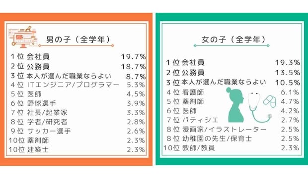 保護者を対象に、子どもになって欲しい職業について尋ねたところ、男の子・女の子の保護者とも、1位は「会社員」、2位は「公務員」でした。こうした安定志向が強い一方、自由回答で「本人がやりたいことを尊重したい」「向いていることを見つけてほしい」という声も多く挙がりました。全体的にランクインしている職業は、男女ともに子どもたちのランキング上位と共通する傾向となりました。
