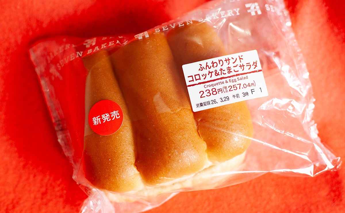 2026年3月24日(火)、セブン-イレブンが発売したのが、「ふんわりサンド コロッケ&たまごサラダ」(税込257円)という新商品です。2月には「ふんわりサンド コロッケ&カレーポテトサラダ」が発売されましたが、サラダの種類が変わったみたいですね。