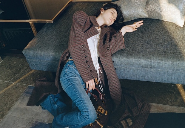 ハウンドトゥースコート¥898,700、レースチュールトップ¥412,500、レースキャミソール¥243,100 ※参考価格、フェードインディゴトラウザーズ¥178,200、チョーカー¥157,300、ネックレス¥122,100、左手人さし指のリング¥73,700、左手中指のリング¥73,700、ベルト¥139,700、ベルトに付けたチャーム¥122,100、バッグ[パディントン]¥398,200、バッグに付けたテールキーリング¥122,100(全てChloé/クロエ カスタマーリレーションズ)