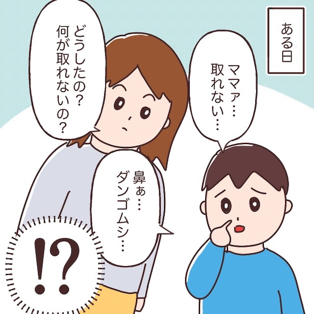 ある日、鼻をやたら気にしている息子。「ママァ・・・取れない」と、ちょっと焦った顔で助けを求めてきました。「どうしたの?何が取れないの?」と聞くと、息子が小さな声で「鼻ぁ・・・ダンゴムシ」とつぶやきます。私は息子を思わず二度見。いや、鼻にダンゴムシって一体どんな状況!?