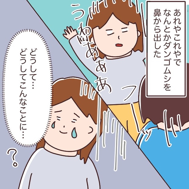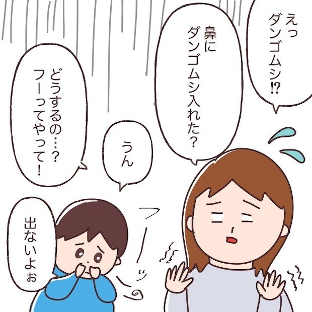 「えっ、鼻にダンゴムシ入れたの!?」鼻にダンゴムシが入っていると聞いて大慌て。「どうしよう・・・フーってやって!」あたふたしながら、息子に必死の形相で指示します。息子は言われた通り鼻からフーッと息を吐きますが、ダンゴムシはびくともしません。