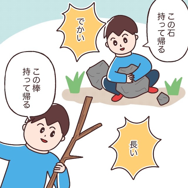 公園に行くと、どこから見つけてきたか分からない大きな石を持ち帰りたがったり、ものすごく長い木の枝を運んできたりして、毎日困ってしまいます。大きいものや長いものが好きなお年頃なのでしょうか。それにしても、持って帰ってどうするつもりなのか・・・。