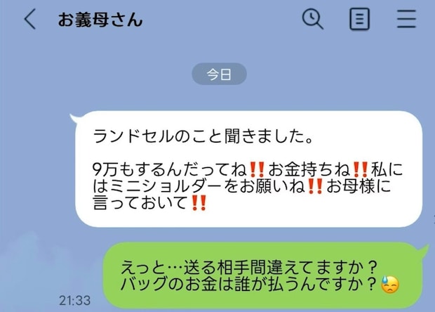 それを高いと思うか安いと思うかは人それぞれですが、息子の嫁の母に自分のバッグを強請るなんて、頭がおかしいとしか思えません😱出典:
