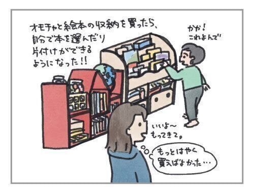 オモチャと絵本の収納を買ったら、自分で本を選んで持ってくるようになったり、お片付けができるようになったりして・・・もっと早く買えばよかった!と思いました(笑)。