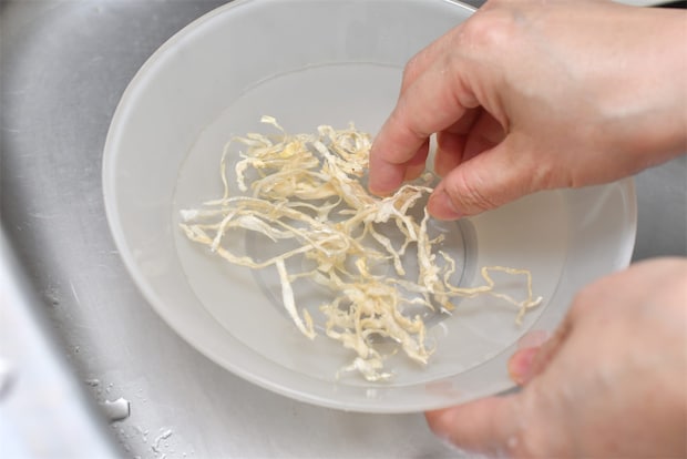 1. 切り干し大根はさっと洗い、水気を軽く絞る。