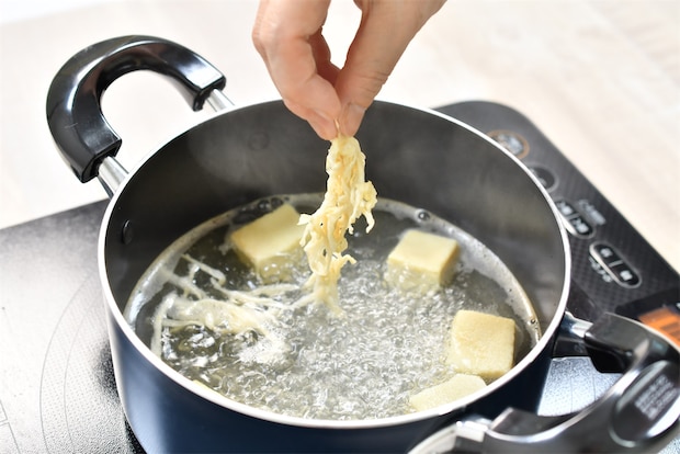 2. 鍋に水と顆粒だし、切り干し大根を入れ、高野豆腐を投入し、2〜3分煮る。