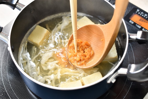 みそは沸騰させると香りが飛んでしまうので、必ず火を弱める、または止めてから溶き入れましょう。