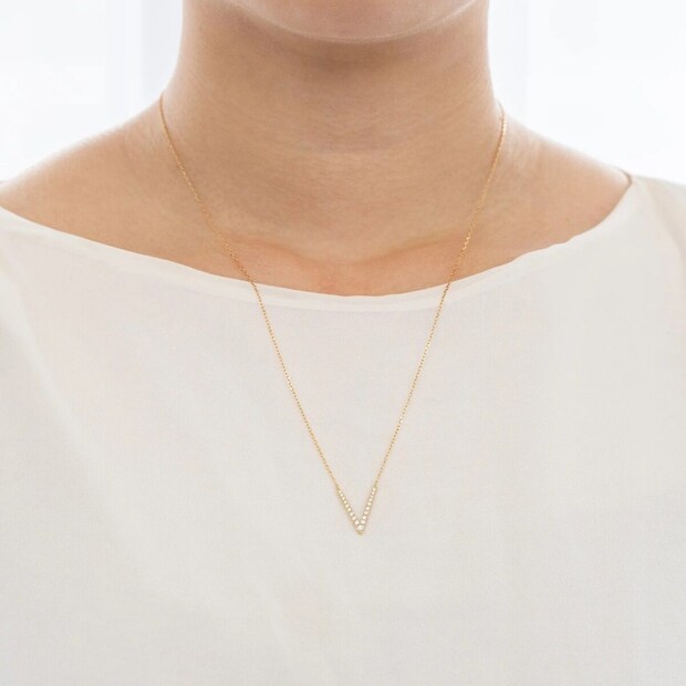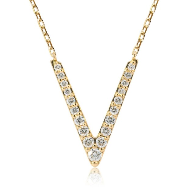 V字のラインに沿って並ぶダイヤモンドは、中央から両サイドへ向かって繊細にグラデーション。V字の頂点からチェーンへとスムーズにつながるよう設計されているから、どんなネックラインにも美しく沿い、デコルテを美しく見せてくれます。