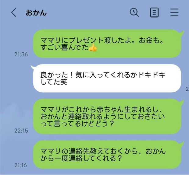 私的に何だか納得がいかなくて、それに気づいた夫が「じゃあお母さんにLINE教えてもいい?」って聞いてみるね!と言ってくれて、LINEをしてくれました。