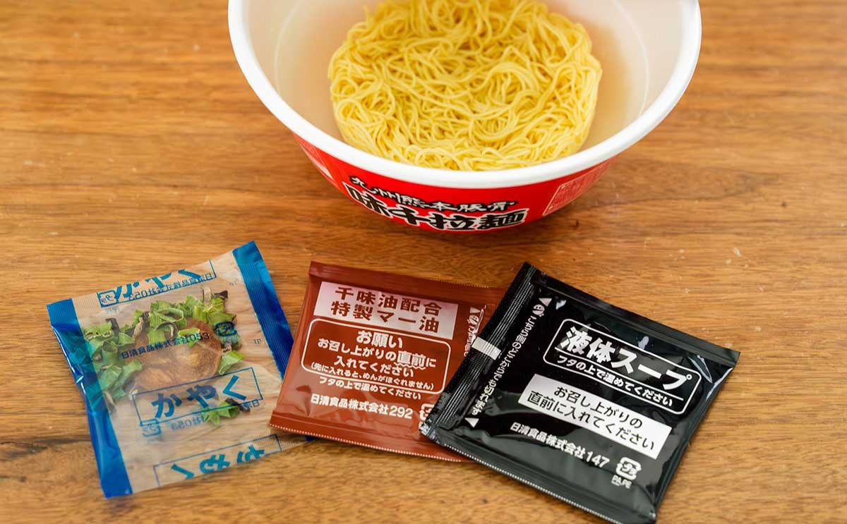 カップの中にかやくを入れ、熱湯を注いで5分待ち、フタの上で温めておいた残りの2袋を加えたら完成です。