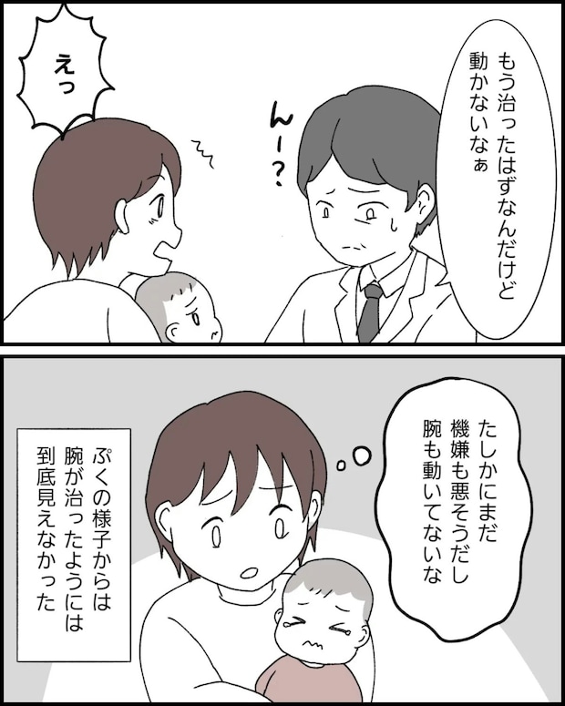 「肘内障」の処置をしてもらい治ったと安心していたのに、娘の右腕は動かないまま。不安になったなっぽさんは、医師に気になることを聞いてみたところ、思わぬことを言われて驚いてしまいます。