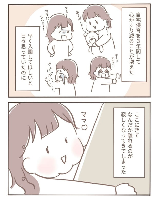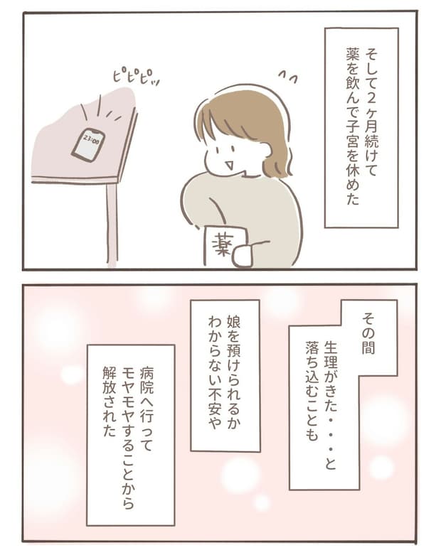 大変だった自宅保育の3年間でしたが、もう少しで幼稚園に入園してしまうと思うと寂しい気持ちになってきてしまいました。次の周期もお休みして娘さんとの時間をおもいっきり楽しもう!と決断するのでした。