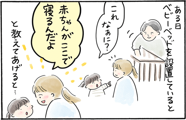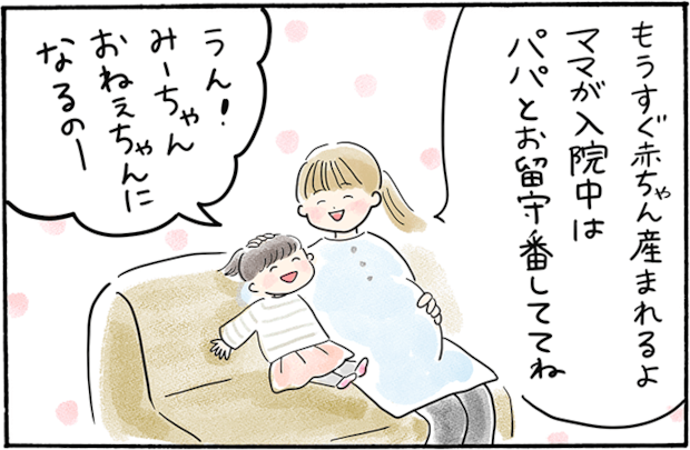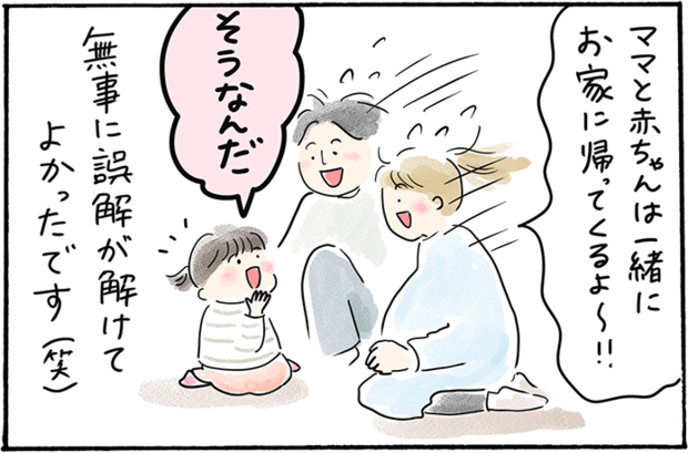 出産間近のママさんは、2歳の娘ちゃんに「もうすぐ赤ちゃんが産まれるよ」「ママは入院するよ」と伝えていたそうです。お姉ちゃんになることを理解している様子に安心していたところ、なんと娘ちゃんは「赤ちゃんはそのまま病院にいる」と勘違いしていたことが発覚! 幼い子どもには、大人の「当たり前」が通用しないということを改めて感じるエピソードです。誤解が解けたことによって、赤ちゃんがより身近に感じられたことでしょう。家族みんなで赤ちゃんを迎える準備をしている様子が目に浮かびますね。