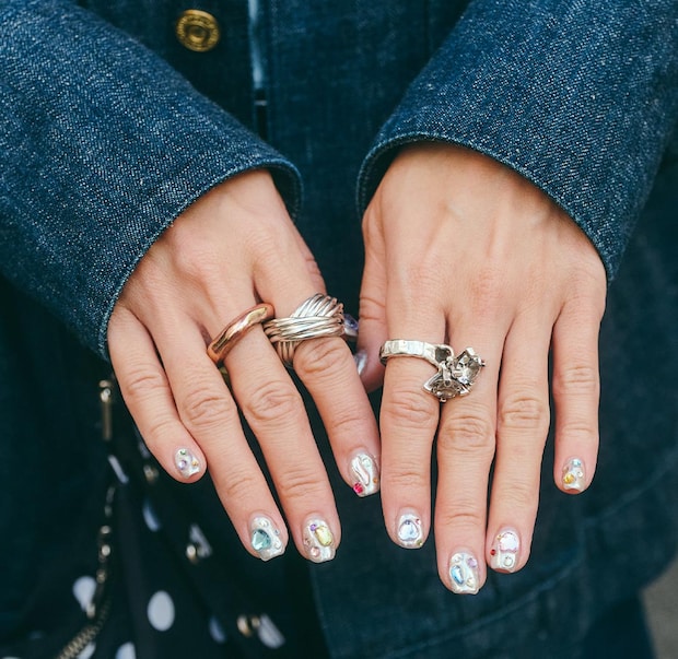 存在感あるリングの重ね付けで、コーデにスパイスをひとふり。カラフルなストーンを散りばめた、アート感あふれる指先も要チェック♪