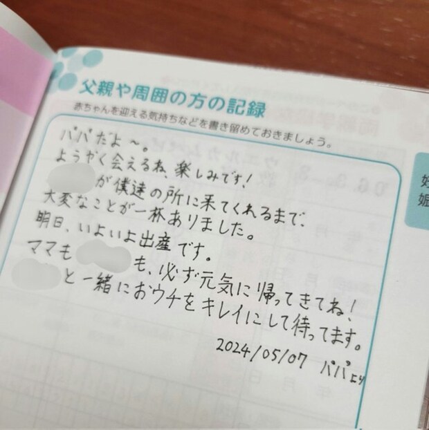 なつ☺︎🌻🍓🤍さんの夫は、翌日に出産を迎えるなつさんと生まれてくる赤ちゃんに向け、母子手帳にメッセージを書いてくれたそう。その言葉からはまさに愛があふれていました。