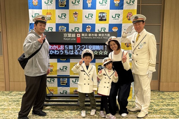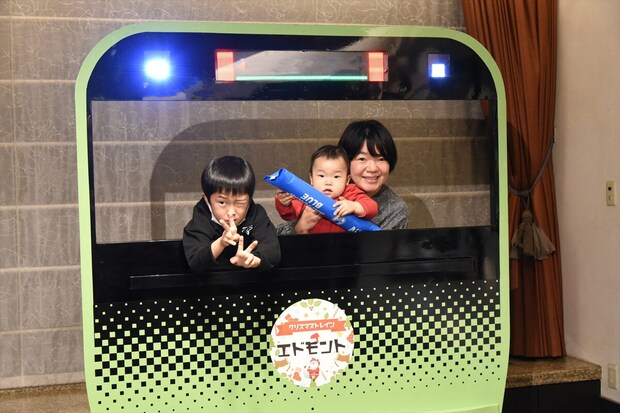 山手線の先頭車をかたどった大型の顔出しフォトパネルでは、家族そろって記念撮影ができます。