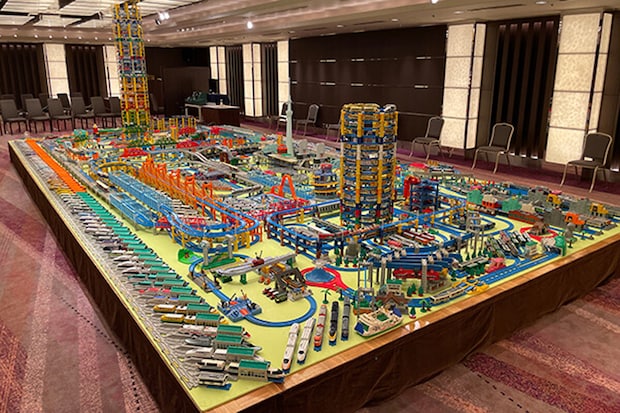 プラレールの巨大ジオラマも展示。駅長さんと缶バッジ制作や記念撮影も