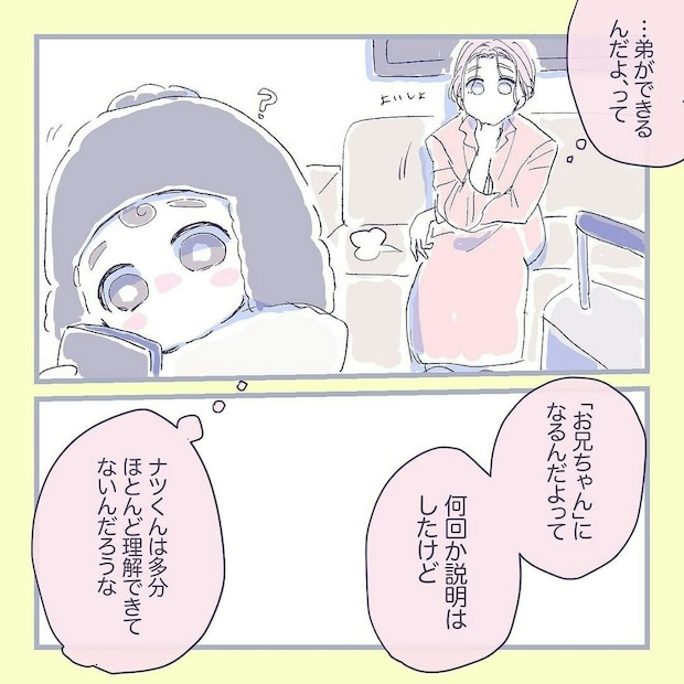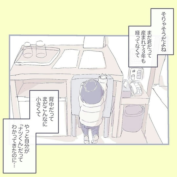 幼い長男・ナツくんの背中を見て、harakoさんは胸中を想像します…。子どもにとって、ひとり占めしていたパパ・ママを取られてしまうのは、受け入れがたい現実かもしれませんね。