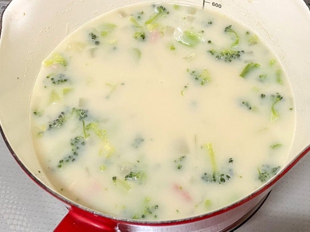 4. 無調整豆乳を加え、ブロッコリーを軽くつぶしながら沸騰直前まで温める。塩で味を調える。