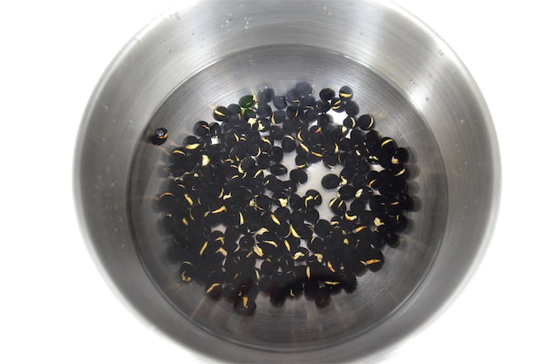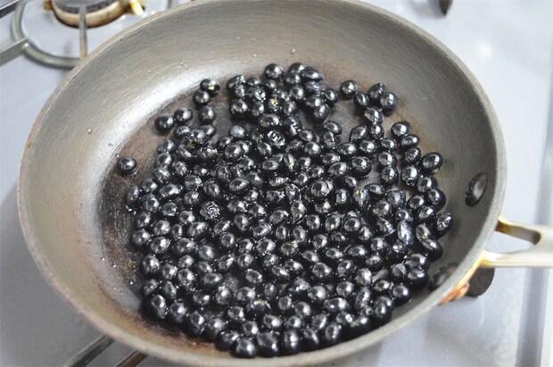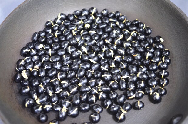 1. 薬豆(黒豆)を洗い、フライパンに入れて中火で炒る。