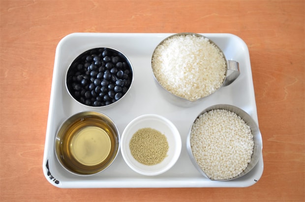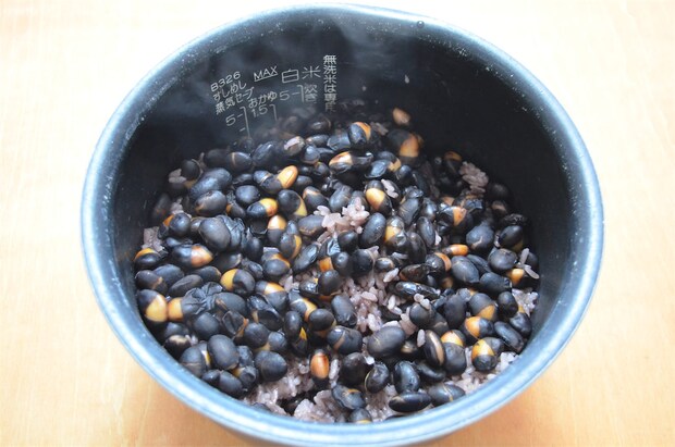 3. うるち米、もち米を洗い、2の水を3合分入れ、昆布だし、薬豆(黒豆)とともに炊飯器で炊く。