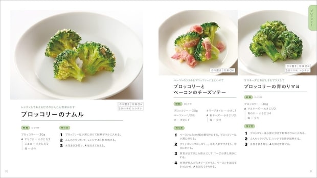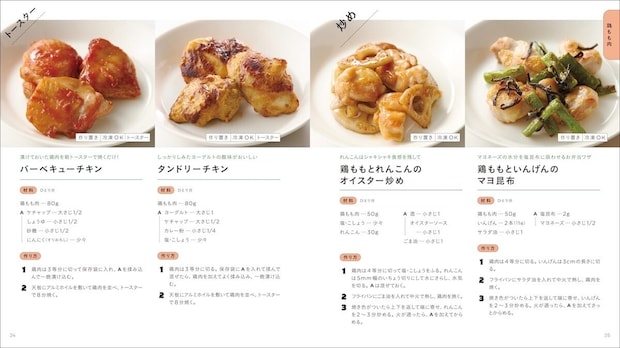 同書で紹介するのは、手早くできる肉、魚、野菜、卵のおかずやストック品など全105品。それぞれに「作り置き」「冷凍OK」「すきまおかずに」「5分でできる」などのアイコンをつけ、忙しい朝に役立つ工夫をしています。