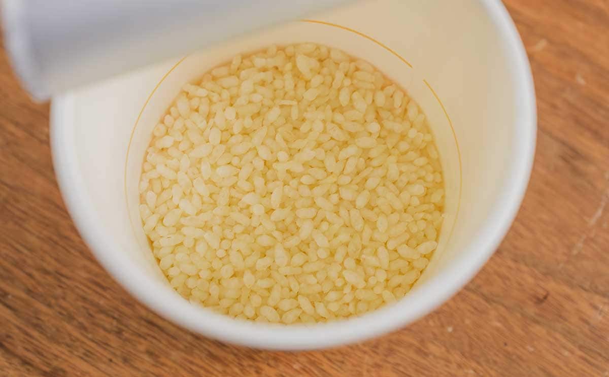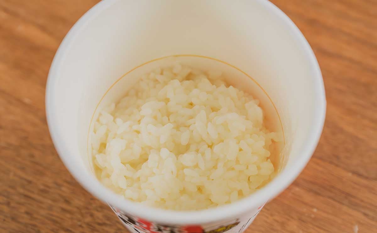 カップの中には、乾燥された白いごはんだけが入っています。