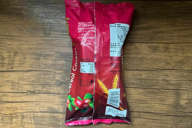 赤いパッケージが売り場でも目を引く、グランベリーのシリアルクッキー。小麦全粒粉とオーツ麦で作った生地に、ドライクランベリーを練り込んでいます。