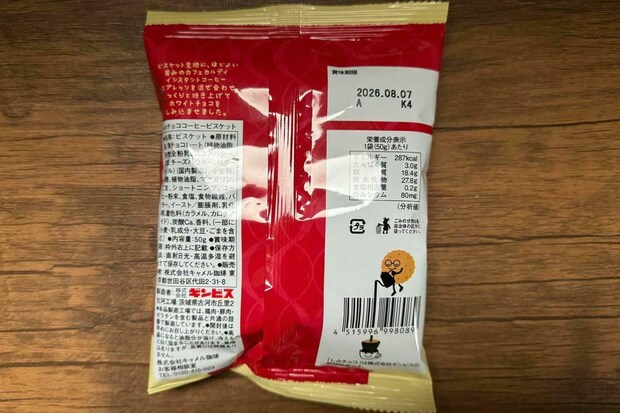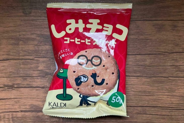 メガネをかけたビスケットのキャラクターが目を引く、カルディオリジナルの「しみチョココーヒービスケット」です。
