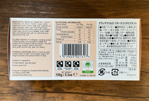 1899年に創業されたイギリス・ヨークシャーの伝統あるビスケットメーカー「グランマワイルズ」のバタースコッチビスケットです。