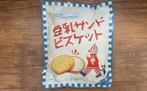 カルディオリジナルの「豆乳サンドビスケット」は、ピエロと黒い犬が描かれた愛らしいパッケージが特徴です。