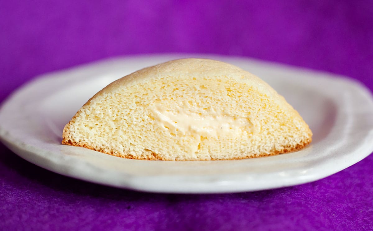 そしてこちらが、半分に切ったもの。生地と色が似ていて見分けがつきにくいかもしれませんが、中からたまごクリームが出てきました。
