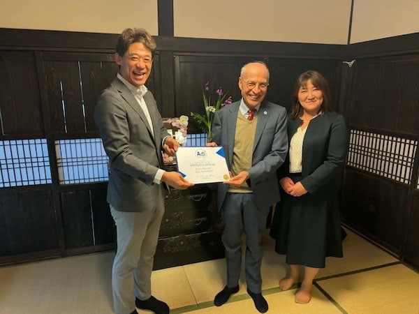 アルベルゴディフーゾ国際認証式の会場にもなった「Kominka ひぐらし庵」。左:ガイアグループ 相澤社長、中:アルベルゴディフーゾインターナショナル ダッラーラ会長、右:ガイアグループ 永倉専務