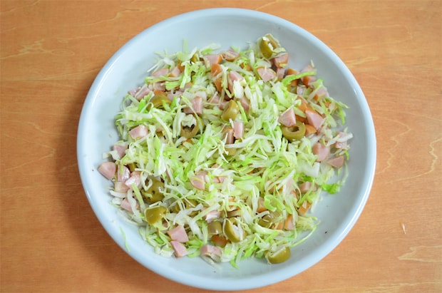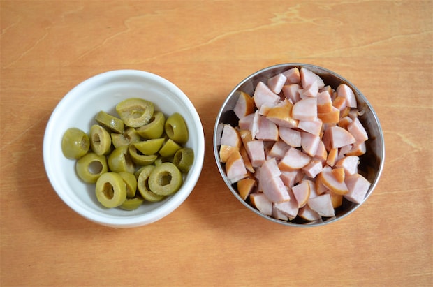 2. ソーセージとオリーブをそれぞれ粗みじん切りして、1と混ぜる。