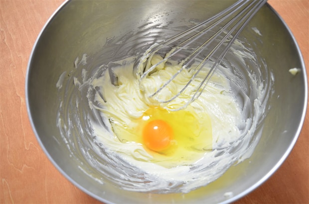 4. 卵をひとつずつ入れ、その都度よく混ぜる。