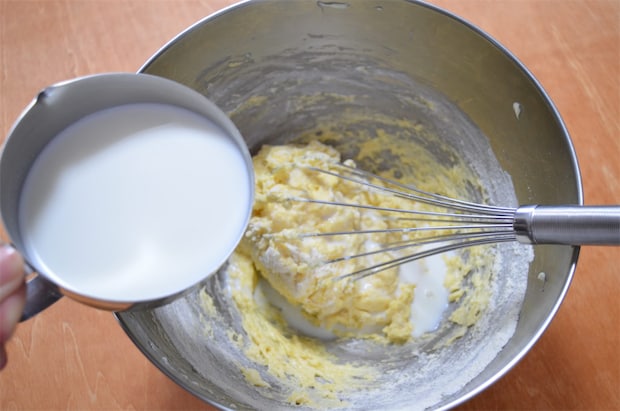 5. ふるっておいた[A]の粉類と牛乳を交互に2,3回に分けて4に加え、さっくり混ぜる。
