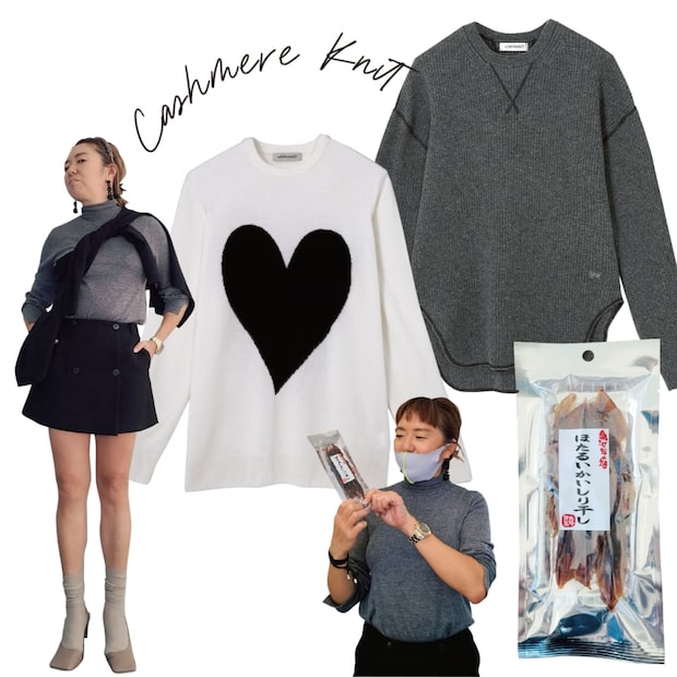 「カ・シ・ミ・ア・ニッ・ト! とにかくカシミア100%が好き過ぎて、COZ manufactured by WRAPINKNOTというカシミアニットだけのラインを作らせてもらっています。オンラインで買えるよ! 冬だけじゃなく、夏のアイテムもあるの。本当に好きなものは、作るのもすごく楽しい。あとミニボトム! スカートでもパンツでもOK。冬でもミニスカはいてますw。あとホタルイカのおつまみ。今って、季節じゃないのかなあ。最近あんまり売ってなくて、撮影現場でのおやつでもなかなか見かけないんです。探して買ってきてくれるオトナミューズの編集部も好きです♡」(安西さん)