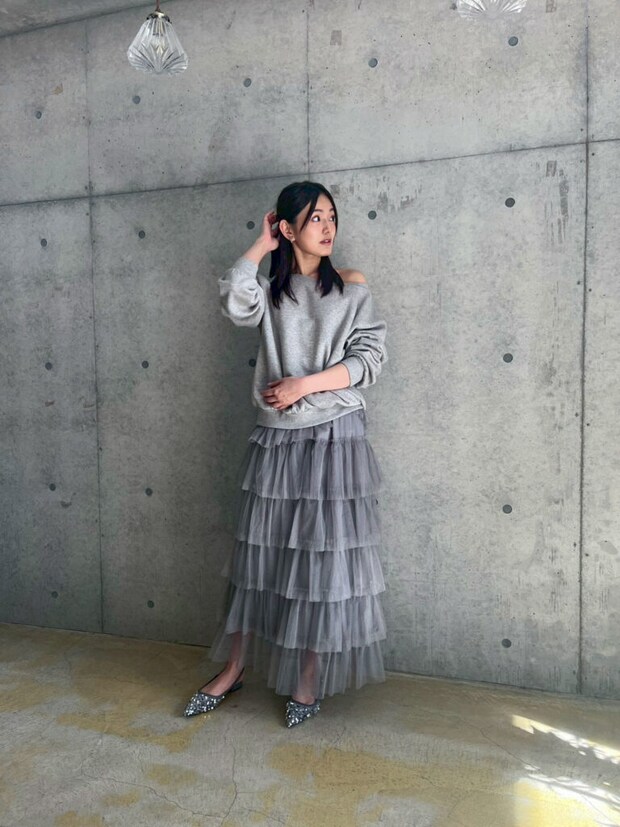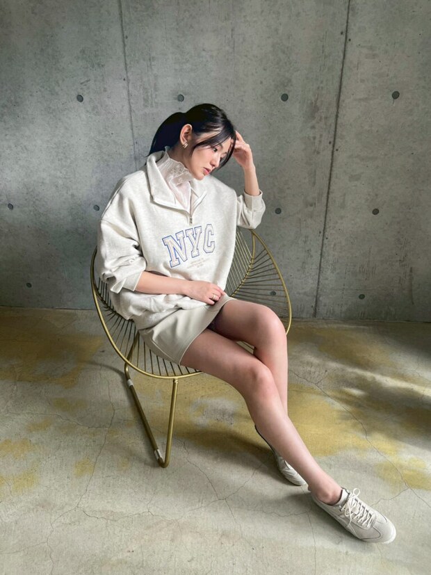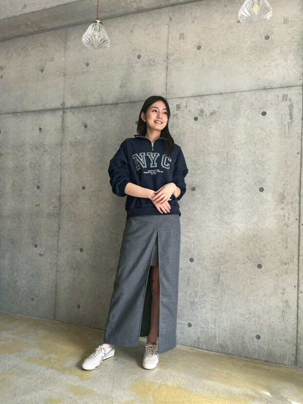 カナさん「スウェットコーデに遊びを足すなら、ボトムスで外すと着回ししやすいですよ。トップスはシンプルな色味なので、ボトムスにカラー物を取り入れてみたり、デザイン性のあるスカートをあえて合わせたりしてもお洒落です。また、インナーにシアーやレースのトップスを入れると簡単にこなれ感が作れます。」