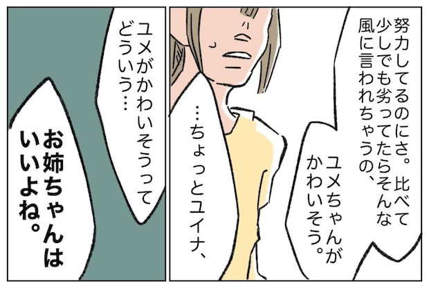 「努力してるのにさ、比べて少しでも劣ってたらそんな風に言われちゃうの、ユメちゃんがかわいそう」そう言うと、姉はムッとした表情で「ちょっとユイナ、ユメがかわいそうってどういう・・・」と返してきました。私はその言葉を遮るように、「お姉ちゃんはいいよね」と言い放ちます。