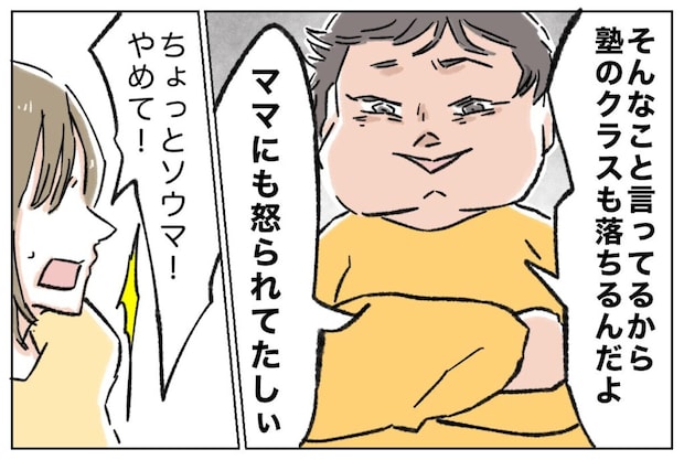 ソウマくんはユメちゃんを見下すような表情を浮かべて、「そんなこと言ってるから塾のクラスも落ちるんだよ、ママにも怒られてたしぃ」と心ない言葉を投げかけます。「ちょっとソウマ、やめなさい!」と姉が慌てて止めますが、ソウマくんは聞く耳を持たず、態度を改めようとはしません。