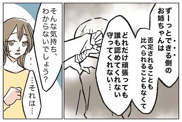 「ずーっとできる側のお姉ちゃんは、否定されることも比べられることもなくて・・・どれだけ頑張っても誰も認めてくれない、守ってくれない、そんな気持ちわからないでしょう?」そう伝えると、姉は「・・・それは」と言葉に詰まっていました。