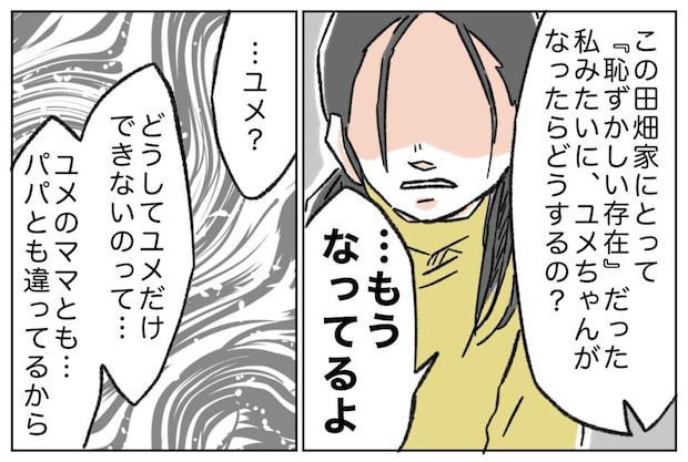 「この田村家にとって『恥ずかしい存在』だった私みたいに、ユメちゃんがなったらどうするの?」私がそう言うと、ユメちゃんが小さな声で「もうなってるよ」とつぶやきました。そして、今まで胸に溜め込んできた思いを吐き出すように、「どうしてユメだけできないのって、ユメのママともパパとも違ってるから・・・」と、震える声で続けます。