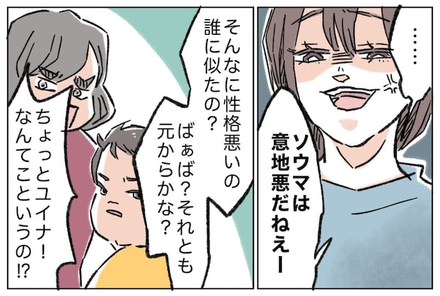 ユメちゃんを見下すようなソウマくんの態度に、私はとうとう我慢できなくなり、思わず「ソウマは意地悪だね~そんなに性格悪いの誰に似たの?ばぁば?それとも元からかな?」と、大人げない言葉を口にしてしまいました。「ちょっとユイナ、なんてこと言うの!?」と母に叱られましたが、一度火がついた私の怒りは、簡単には治まりませんでした。