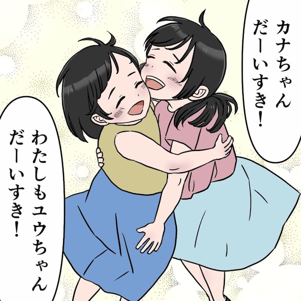 公園で遊ぶ娘とお友達。「カナちゃんだーいすき!」「わたしもユウちゃんだーいすき!」そう言い合ってじゃれる2人を見ている私。