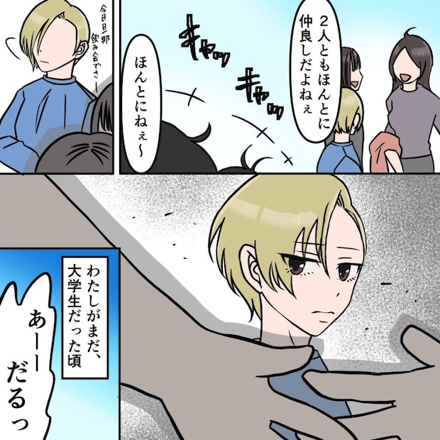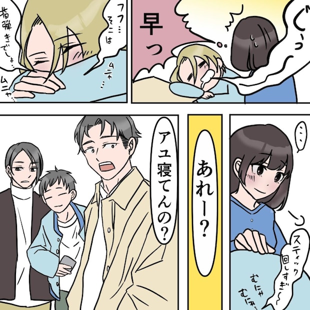 前日は別の友達と朝方まで飲んで語っていた私。起こしてくれるというサユリの言葉に甘えてその場で突っ伏して寝ていると、男友達が「アユ寝てんの?」とガヤガヤ言いながらやってきました。私はサユリとは真逆の性格。どちらかというと男友達の方が多いかな。あいつらもきっと私のことを女子としては見ていないだろうな。